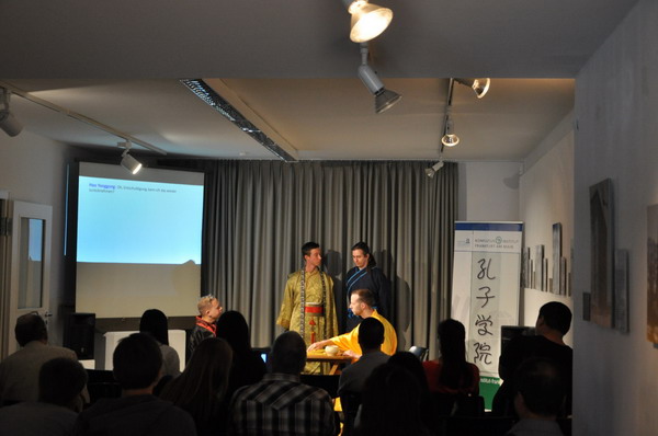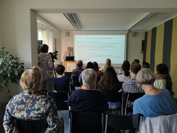 与往届话剧节一样,今年的活动也分为专家讲座部分和学生表演部分。7日晚上,来自德国特里尔大学汉学系的著名汉学家卜松山教授(Prof. Karl-Heiz Pohl)以题为《佛家思想视角下的<红楼梦>》的讲座拉开了本次话剧节的序幕。卜松山教授首先向德国观众介绍了《红楼梦》这本巨著在中国文学史上的重要地位、德文译本现状、故事梗概与阅读研究角度等概况。之后,卜松山教授引经据典、深入浅出地向观众们讲解了“色”、“空”、“真如”、“不二”等中国佛家思想的核心概念,并从该角度解读《红楼梦》中的人物命运与家族发展,引导德国读者深入理解《红楼梦》,也让孔院“福”剧团参演《红楼梦》的学生们更深刻地理解了这部中国经典作品。