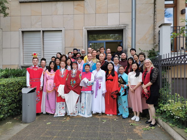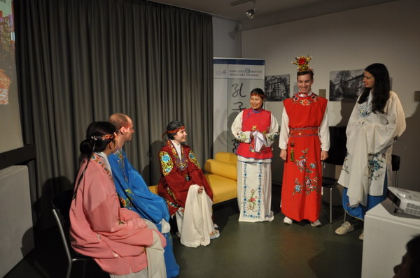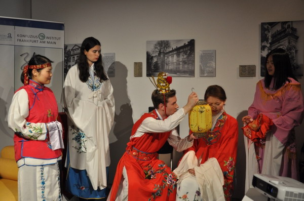 接下来法兰克福大学孔子学院“福”剧团的学生们表演了他们的年度大戏--《红楼梦》选段收官之作。话剧表演作为法兰克福孔院的品牌项目已经走过了六年的时光,话剧团的学生们表演过《甄嬛传》、《奋斗》、《红楼梦》开篇选段等经典剧目,此次表演的《红楼梦》终篇“金玉良缘”历时一年,学生们认真研读原著,记忆、背诵晦涩难懂的台词,一遍遍校正自己的发音,观看越剧版和电视版《红楼梦》,揣摩人物心理和表情,终于用自己对故事的诠释将这部巨著的经典情节完整地呈现在舞台上。他们的表演引起了观众的强烈共鸣,让现场所有人久久地沉浸在人物的悲欢离合之中。