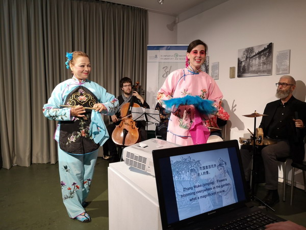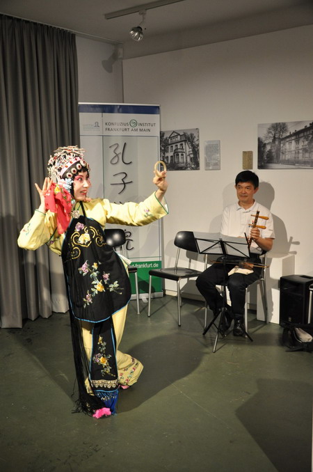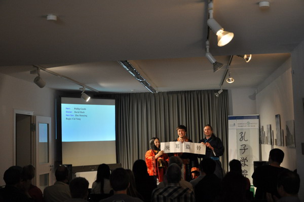 随后,来自法国巴黎中国文化中心的表演团和来自德国京剧协会的演员们为观众们奉上了精彩的评剧联唱和京剧联唱。法国的客人第一次登上德国孔院话剧节的舞台,但他们演唱的《花为媒》、《刘巧儿》和《秦香莲》声情并茂,观众不时报以热情的掌声。尤其《花为媒》中“媒婆”的表演更是惟妙惟肖,专家直呼“仿佛赵丽蓉老师的音容笑貌又出现在眼前”;作为孔院的老朋友,德国京剧协会的演员们保持一如既往的高水准,为观众们表演了京剧经典剧目《拾玉镯》、《追韩信》、《四郎探母》和《空城计》,也让观众过了一把京剧瘾。