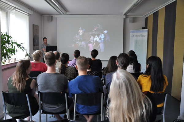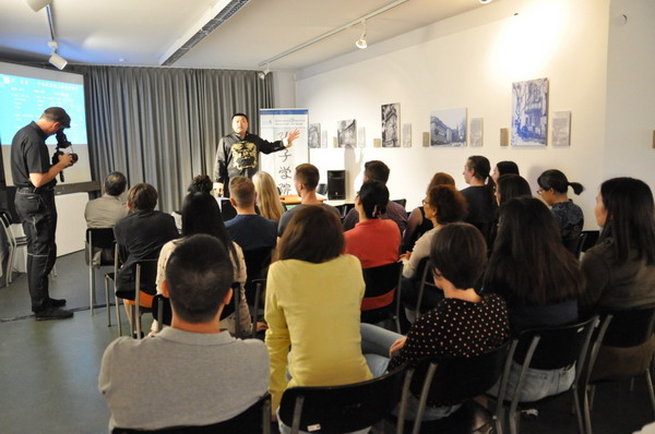 随后,旅德曲艺表演艺术家、德国中华民乐社社长刘辉先生以《从剧本到舞台:中文话剧表演小谈》为题,为同学们带来了一场精彩的工作坊。他从如何正确地吐字发音说起,通过列举在英、德、汉语中出现的若干个容易混淆的辅音在发音上的差异,传授如何在舞台上正确发音的各种技巧,他还通过搜寻一组组有着共同的汉语四声组合的成语,让学生现场实践、感受汉语四声操练方法。此外,他还就剧本台词的断句、舞台上表演风格和规范等与学生进行了交流与互动,引起听众热烈的反响。