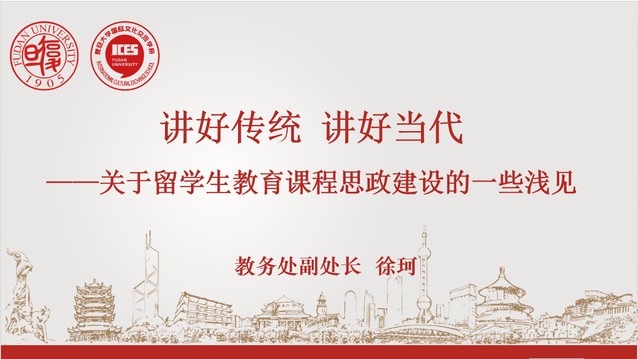2022年8月16日下午,国际文化交流学院课程思政教学研究中心面向全院教职工在线举办了专题学习活动,邀请学校教务处副处长徐珂就留学生教育课程思政建设作了题为“讲好传统 讲好当代”的辅导报告。教务处处长蒋最敏和国际关系与公共事务学院院长苏长和协同工作团队到会指导,学院副院长胡文华主持本次活动。